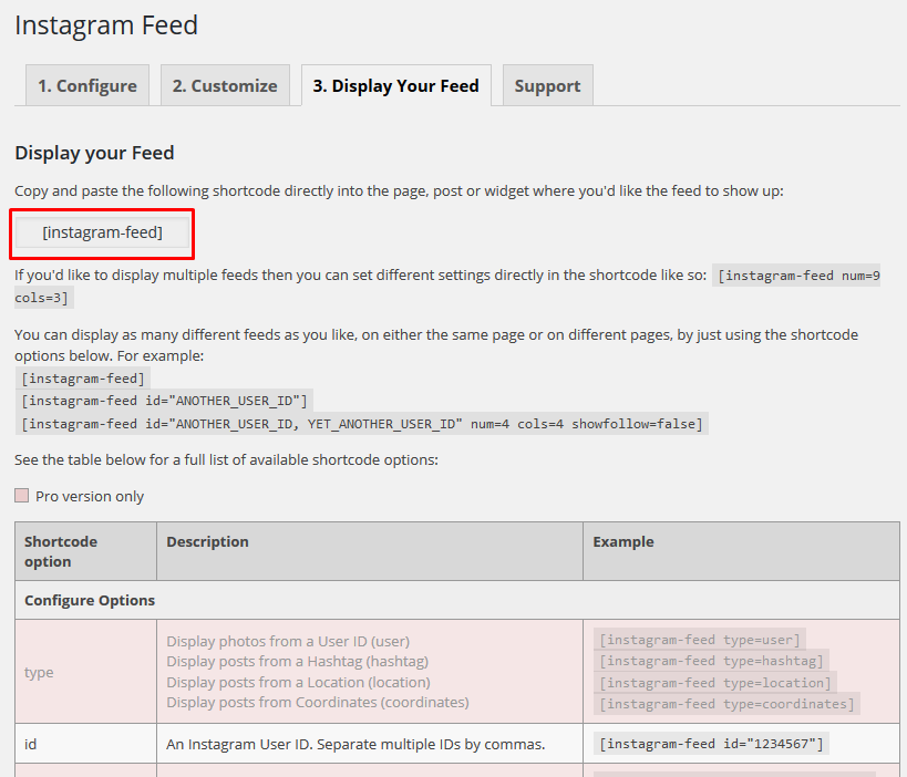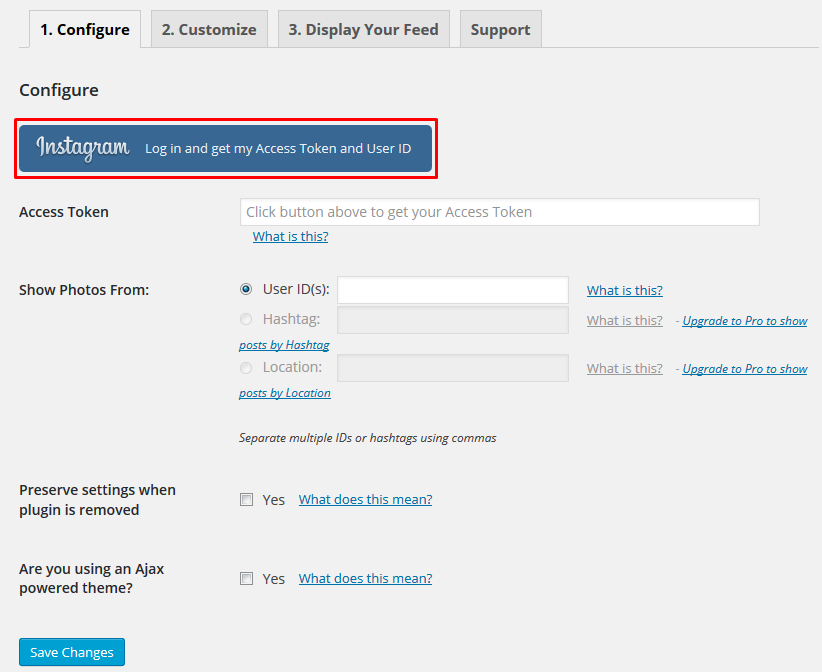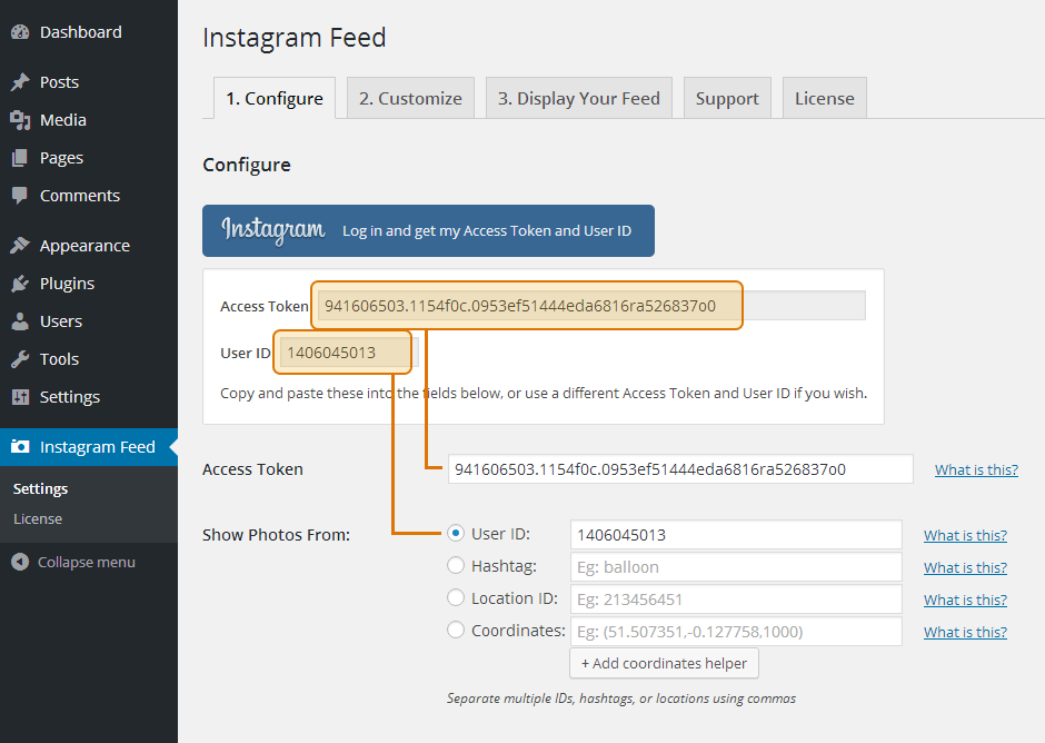 Once the plugin is installed, you’ll now see the Instagram Feed menu appear in your WordPress menu. Please go to WP Dashboard=> Instagram Feed=> click on the Configure tab=> click on the large blue button to get your Instagram Access Token and User ID. Copy and paste these details into the relevant Access Token and User ID fields.