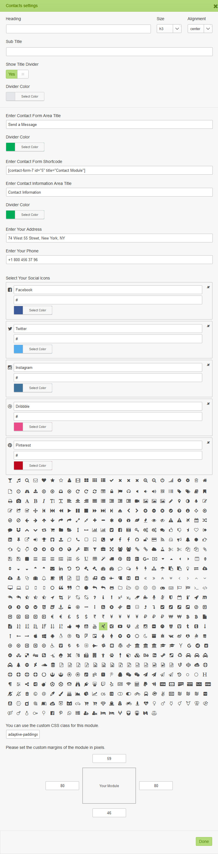The module has a lot settings and fields that you need to fill with the info: Heading, Sub Title, Show Title Divider, Enter Contact Form Area Title, Divider Color, Enter Contact Form Shortcode, Enter Contact Information Area Title, Enter Your Address, Enter Your Email, Enter Your Phone, Select Your Social Icons.